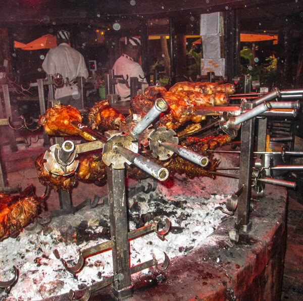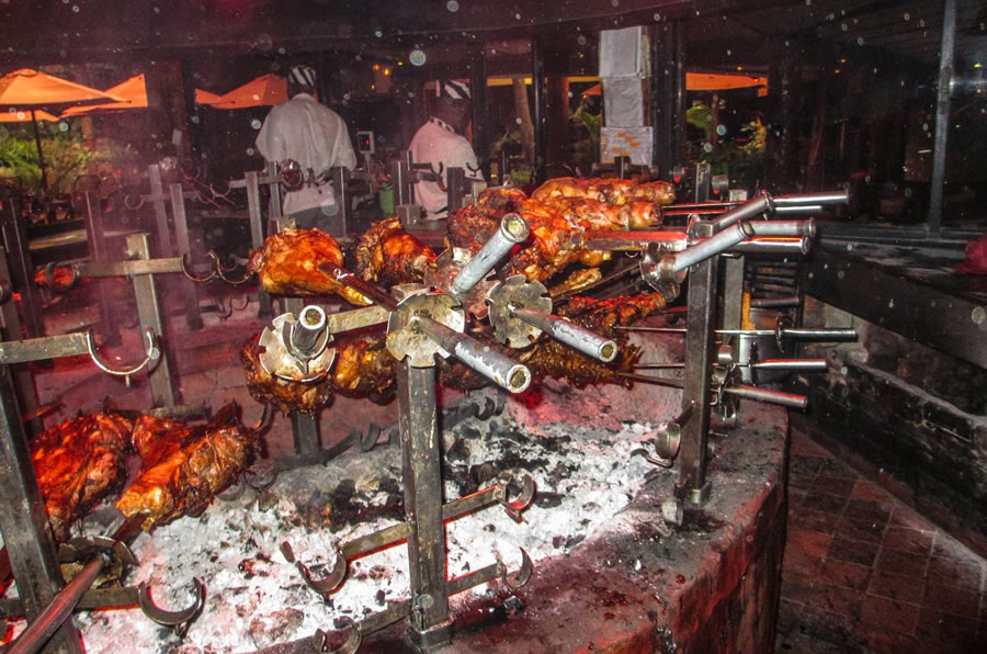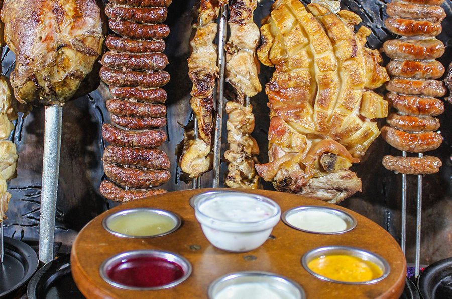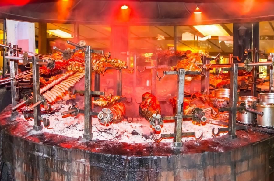 Normally waiters welcome you for starters with a delicious hot soup, and then carry the meat swords around the restaurant, carving unlimited amounts of the prime meats onto sizzling, cast iron plates in front of you. A wide selection of salads, vegetable side dishes, and a variety of exotic sauces accompany the meat feast.